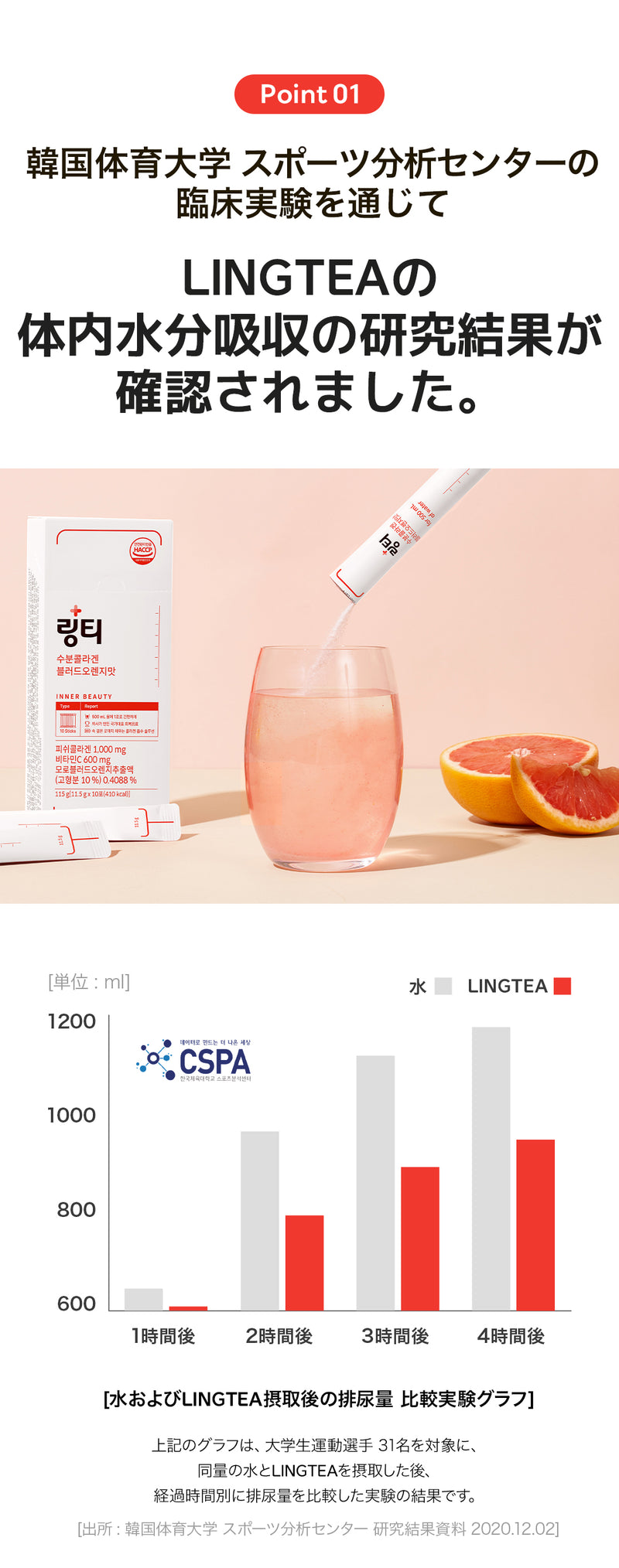 LINGTEAうるおい水分コラーゲンは、既存のLINGTEA ORIGINALの水分吸収ノウハウに加え、フィッシュコラーゲン、ビタミンC、ヒアルロン酸、N-アセチルグルコサミン、グルタチオン、ビタミンE、トマト抽出物を配合した製品です。
