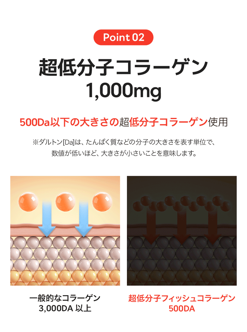 一般的なコラーゲンが3,000DA以上の大きさであるのに対し、より浸透しやすい500Da以下の大きさの超低分子コラーゲンを使用。
