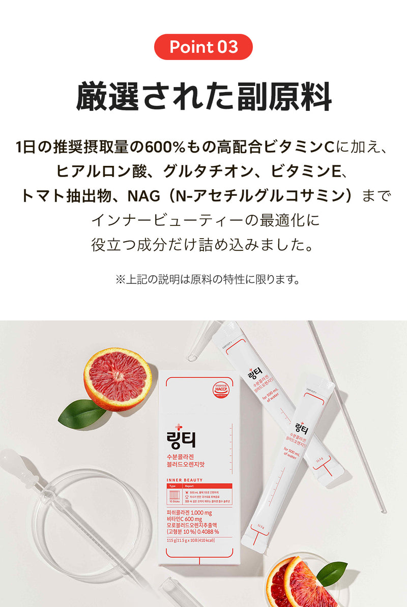 1日の推奨摂取量の600%もの高配合ビタミンCに加え、ヒアルロン酸、グルタチオン、ビタミンE、トマト抽出物、NAG (N-アセチルグルコサミン)を配合