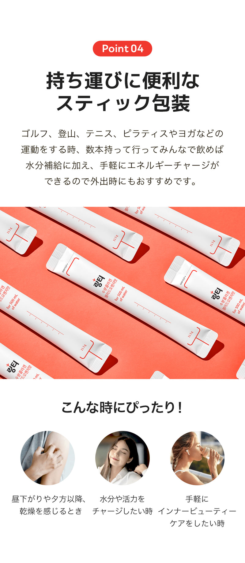 ゴルフ、登山、テニス、ピラティスやヨガなど運動をする時、数本持って行ってみんなで飲めば水分補給に加え、手軽にエネルギーチャージができます。