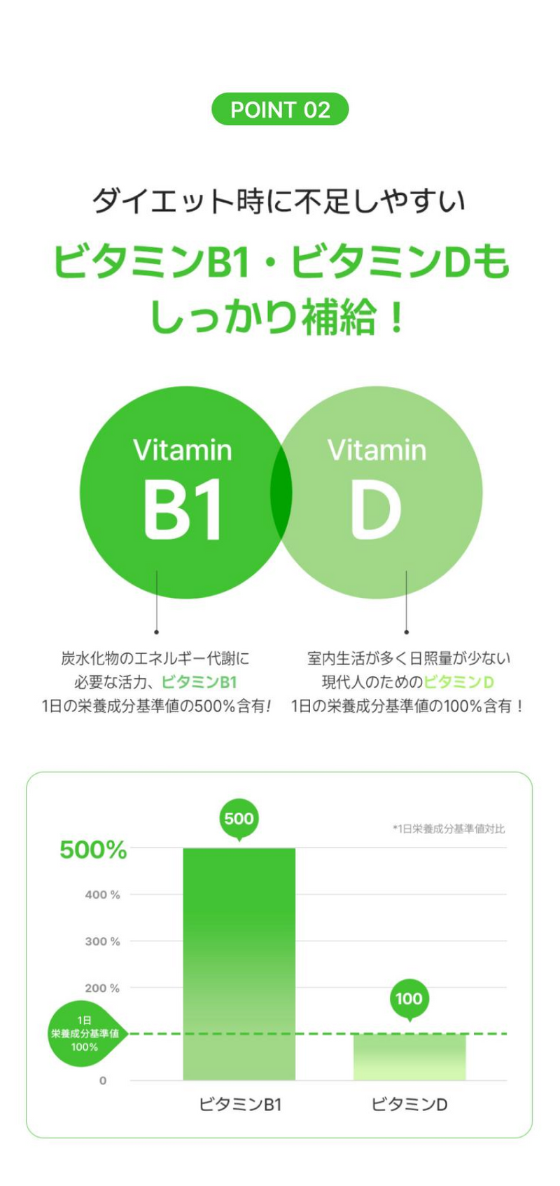 たんぱく質0 %、脂質0 %、炭水化物3 %、ナトリウム(食塩相当量)11 %、ビタミンB1 500%、ビタミンD 100%